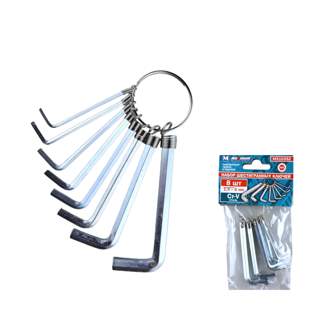 Набор состоит из 8-ти шестигранных ключей 1,5-6 мм на кольце предназначенных для работы с винтами имеющими внутренний шестигранник HEX. Универсальный набор предназначен для выполнения ремонтных и сборочных работ. Инструменты подходят для частого применения и высоких нагрузок, так как изготовлены из высококачественной термообработанной инструментальной стали.