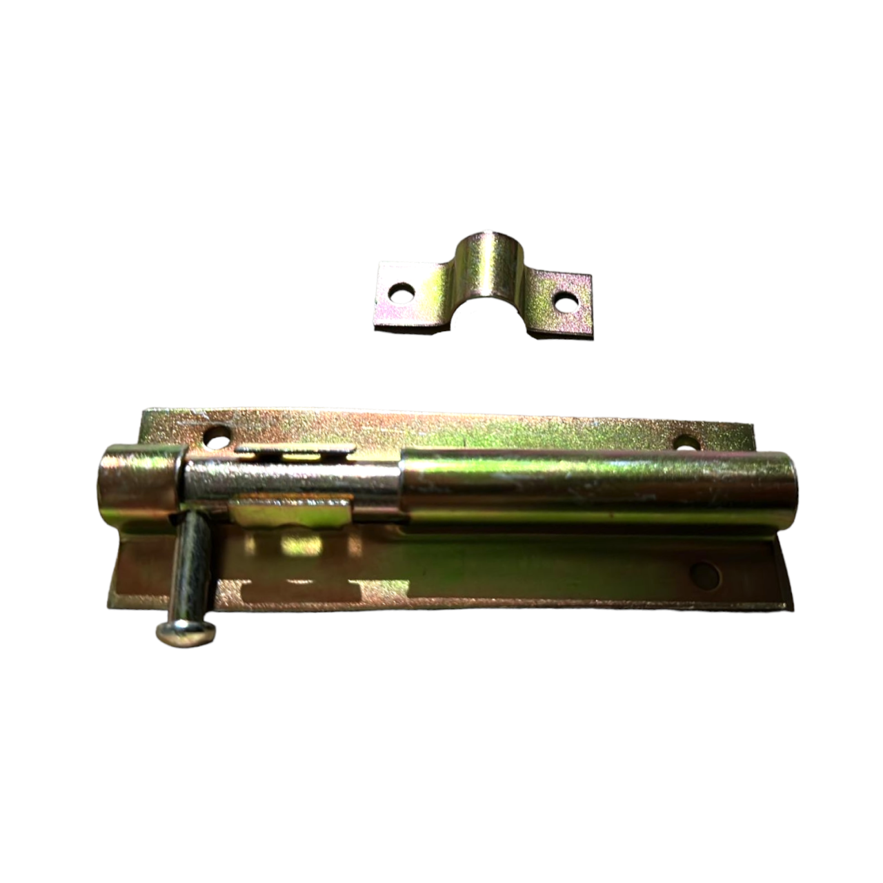 Накладной дверной шпингалет 100 мм считается самой простой и в то же время надёжной конструкцией. Задвижка-шпингалет выполнен из стали покрытый желтым цинком 38x100 мм предназначен для фиксации створок дверей в закрытом положении. Круглая ручка, зафиксированная в закрытом положении надежно препятствует случайному открытию: ход ригеля 50 мм. Число отверстий для шурупов 6.