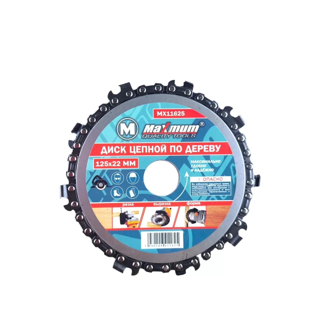 Отрезной диск 125 мм оснащен растянутой по окружности пильной цепью и применяется при резке, фрезеровании, изготовлении гнезд для шипов и моделировании деревянных изделий. Цепь установлена на два диска из высокопрочной нержавеющей стали за счет чего обеспечивается безопасность применения с высокооборотистыми УШМ.